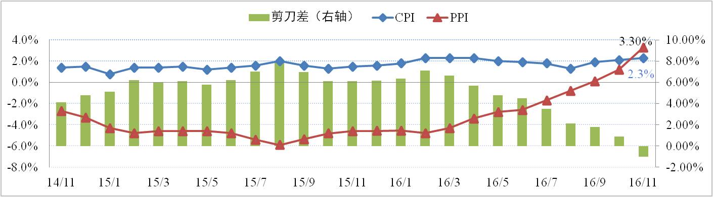 據(jù)國家統(tǒng)計局數(shù)據(jù)顯示,11月份CPI指數(shù)同比上漲2.3%,環(huán)比上升0.2個百分點;PPI指數(shù)創(chuàng)5年來新高同比上漲3.3%,環(huán)比上升2.1個百分點。雖然CPI、PPI同步上漲,但PPI的漲幅明顯高于CPI,說明物價上漲主要集中在上游原材料行業(yè),而中下游行業(yè)由于終端需求疲軟被迫承受來自上游成本壓力。
