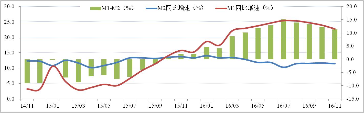 據(jù)央行數(shù)據(jù)統(tǒng)計顯示,中國11月M2貨幣供應(yīng)同比增速為11.4%,環(huán)比回落0.2個百分點;M1貨幣供應(yīng)同比增速為22.7%,環(huán)比回落1.2個百分點。 M1與M2剪刀差進一步縮小為11.3%。
