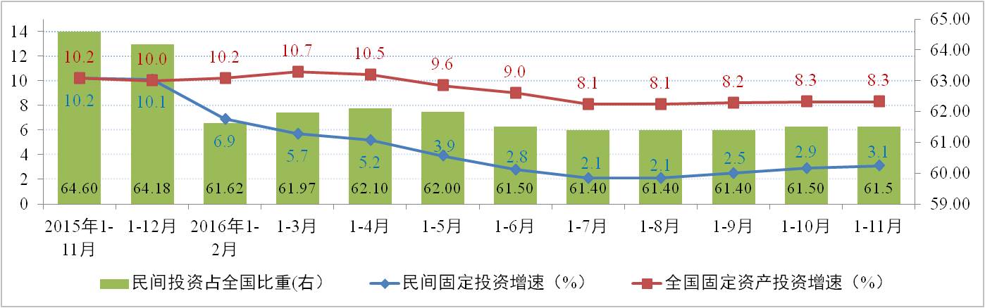 據(jù)國家統(tǒng)計局統(tǒng)計數(shù)據(jù)顯示,2016年1-11月,全國固定資產(chǎn)投資同比名義增長8.3%,基本呈現(xiàn)橫向上升態(tài)勢但增速較小,對應(yīng)了經(jīng)濟的L型特征。民間固定資產(chǎn)投資同比名義增長3.1%,增速環(huán)比上升0.2個百分點。民間固定資產(chǎn)投資占全國固定資產(chǎn)投資(不含農(nóng)戶)的比重為61.5%,與上月持平。