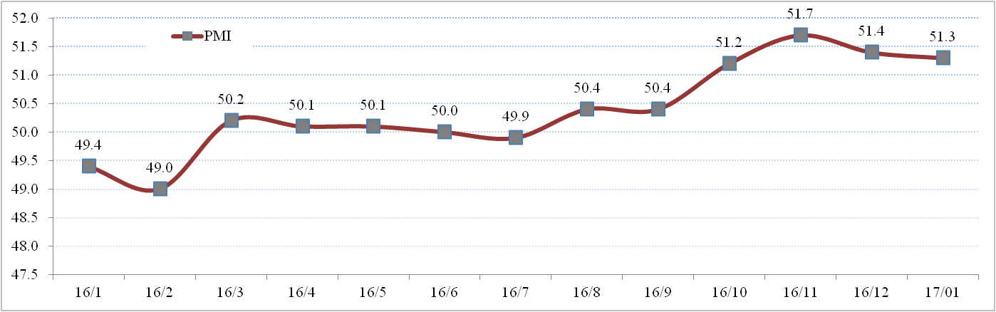 國家統(tǒng)計局?jǐn)?shù)據(jù)顯示,2017年1月份,中國制造業(yè)采購經(jīng)理指數(shù)(PMI)為51.3%,比上月微落0.1個百分點(diǎn),連續(xù)6個月站上50%的榮枯線,延續(xù)平穩(wěn)擴(kuò)張態(tài)勢。其中,生產(chǎn)指數(shù)和新訂單指數(shù)分別為53.1%和52.8%,分別較上月回落0.2和0.4個百分點(diǎn)。總的來看,反映供需變化的生產(chǎn)和新訂單指數(shù),延續(xù)去年四季度以來向好態(tài)勢,說明當(dāng)前供需基本面良好,增長態(tài)勢均衡。