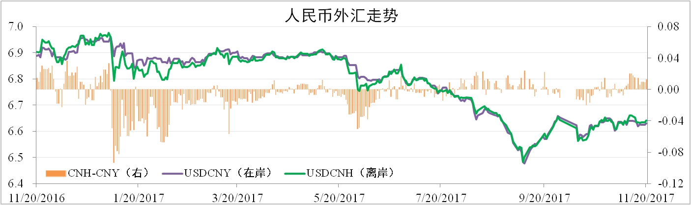 近期人民幣匯率整體維持震蕩走勢,一方面特朗普訪華達成匯率協調的共識,另一方面市場對中美兩國經濟前景表現樂觀。截至11月20日,在岸人民幣報6.6299,環比微跌0.17%,離岸人民幣報6.6425,環比跌0.33%。