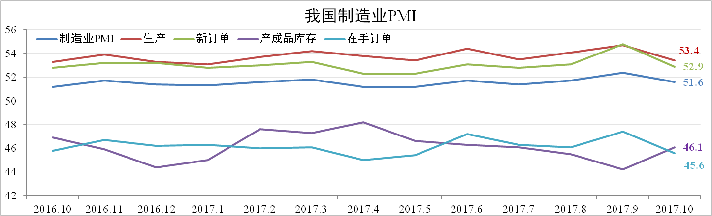 10月份我國官方制造業PMI為51.6,較上月回落0.8,達到年內均值。從分項看,生產、新訂單與在手訂單紛紛下降,產成品庫存大幅上升,說明下游需求不足,制造業活動較上月放緩。