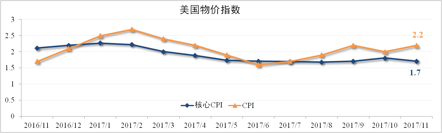 11月美國CPI為2.2%,符合市場預期,主要受能源價格上漲提振。剔除能源因素的核心CPI為1.7%,較上月下滑0.1個百分點,低于市場預期,主要是受住房價格增速放緩以及醫療服務價格下跌影響所致。