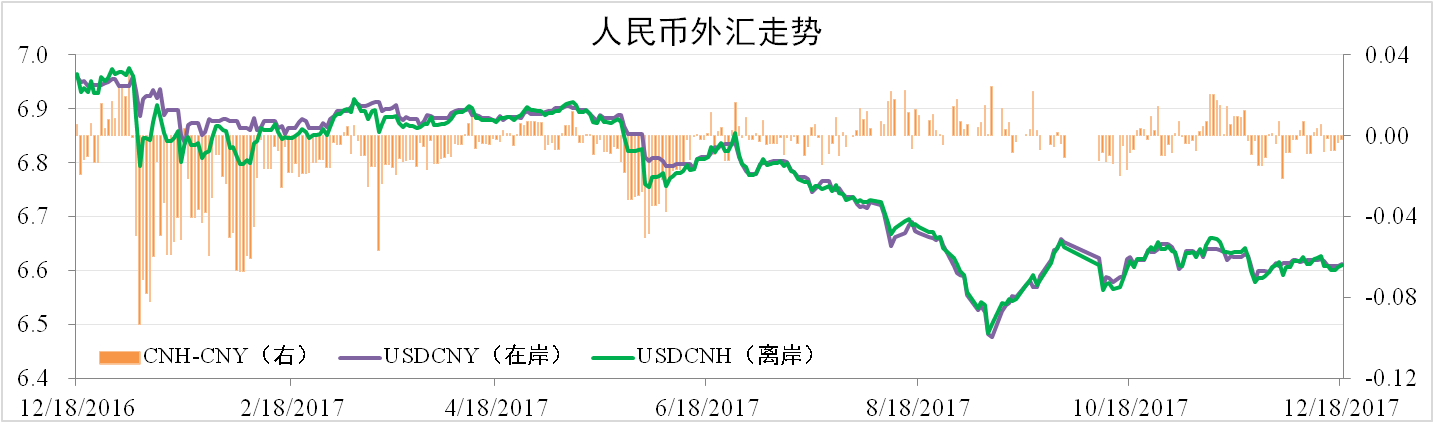 近期人民幣走勢震蕩,總體沒有較大波動。截止12月18日,離岸人民幣報6.6093,環(huán)比貶值0.4%,在岸人民幣報6.6111,環(huán)比貶值0.2%。