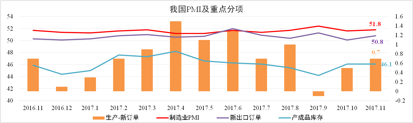 11月我國制造業(yè)PMI為51.8,較10月上升0.2。其中生產(chǎn)指數(shù)與新訂單指數(shù)差額擴(kuò)大0.2至0.7,新出口訂單上升0.7至50.8,產(chǎn)成品庫存與上月持平于46.1。