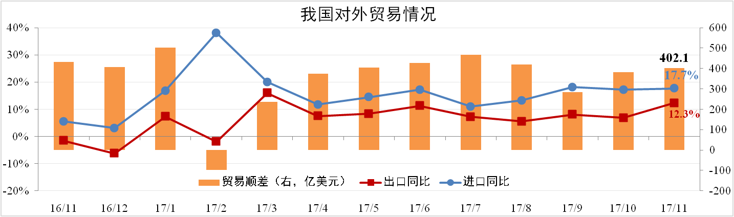 11月我國進(jìn)口量為1771.68億美元,同比上漲17.7%,出口量為2173.82億美元,同比上漲12.3%,二者均大超市場預(yù)期。11月貿(mào)易順差402.14億美元,同比下降6.92%,環(huán)比上漲5.33%。