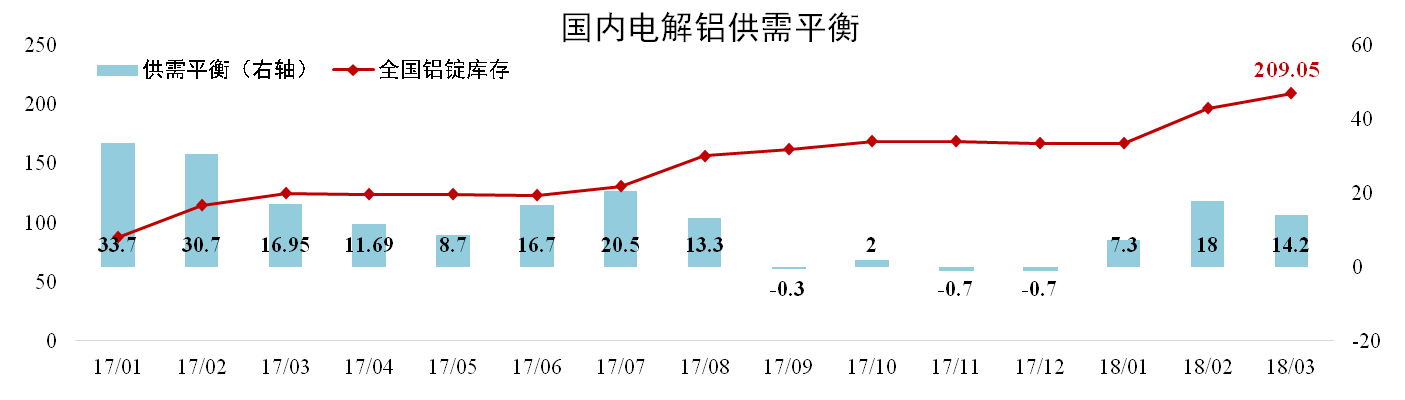 發(fā)稿時間:2018-04-27據(jù)阿拉丁數(shù)據(jù),3月份我國電解鋁產(chǎn)量302萬噸,同比下跌2.89%,環(huán)比上升9.14%。凈進口0.2萬噸,總供應(yīng)量302.2萬噸,總消費量288萬噸,當月理論供應(yīng)過剩14.2萬噸。3月底全國鋁錠庫存209.05萬噸,環(huán)比上漲6.22%。