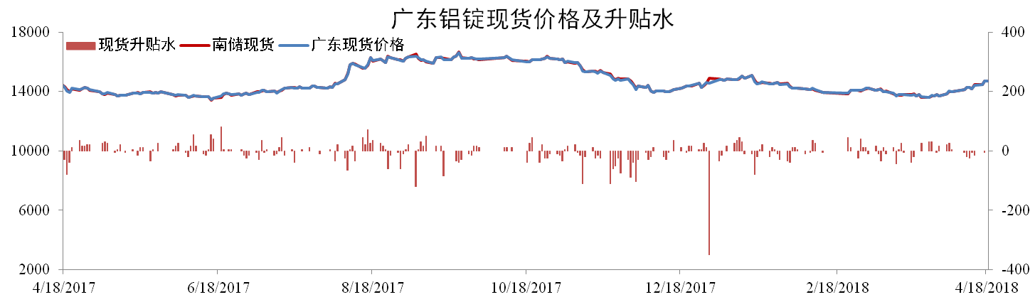 截至4月18日,南儲華南鋁錠現(xiàn)貨價報14,720元/噸,環(huán)比上升6.74%,廣東現(xiàn)貨成交價報14,720元/噸,環(huán)比上升7.05%。截至2018年4月12日,全國鋁錠庫存為211.74萬噸,環(huán)比上升3.13%。南海庫存為42.11萬噸,環(huán)比上升8.59%。