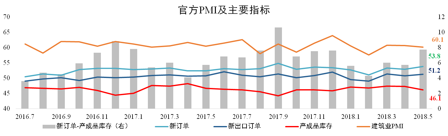 5月份產成品庫存為46.1點,較4月下降0.9個百分點;新訂單為53.8點,較上月上升0.5個百分點,其中新出口訂單為51.2,較上月上升0.5個百分點。建筑業PMI延續下滑走勢,較4月下滑0.5個百分點至60.1點。