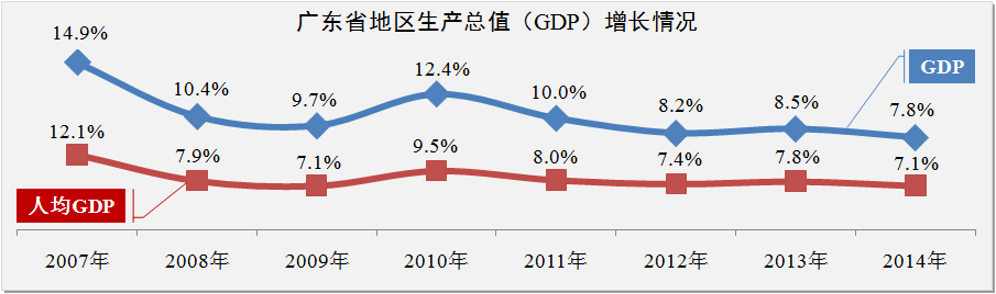 廣東經(jīng)濟(jì)方面。2014年廣東實(shí)現(xiàn)地區(qū)生產(chǎn)總值6.8萬億,全國占比10.7%,同比增長7.8%,較全國增速多0.4個(gè)百分點(diǎn)。其中第一產(chǎn)業(yè)增長3.3%,第二產(chǎn)業(yè)增長7.7%,第三產(chǎn)業(yè)增長8.2%。人均GDP方面,全年人均GDP同比增長7.1%,絕對(duì)收入首次超過1萬美元。總體而言,2014年全省經(jīng)濟(jì)運(yùn)行雖有所回落,但運(yùn)行基調(diào)基本平穩(wěn)。