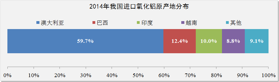 進口方面。2014年度我國進口氧化鋁共528萬噸,進口同比增長37.7%。從原產(chǎn)地上看,全年最大進口國仍為澳大利亞,進口氧化鋁占比59.7%;前四位原產(chǎn)地氧化鋁進口占比高達90.9%。進口價格方面,全年進口氧化鋁均價為382.34美元/噸,折合人民幣均價2343元/噸。